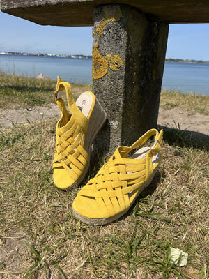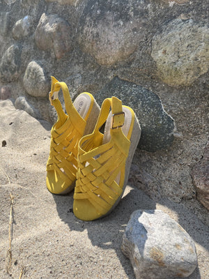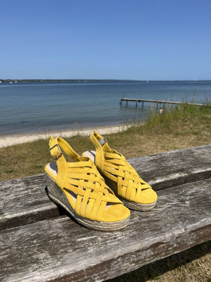 Med en hæl på ca. 5 cm får du den rette mængde højde, uden at det går ud over komforten. Den smukke gule farve tilfører varme og friskhed til ethvert outfit, mens det flettede mønster foran giver en ekstra dimension af elegance og finesse.