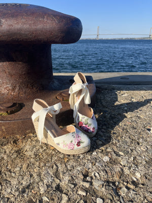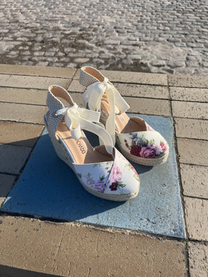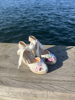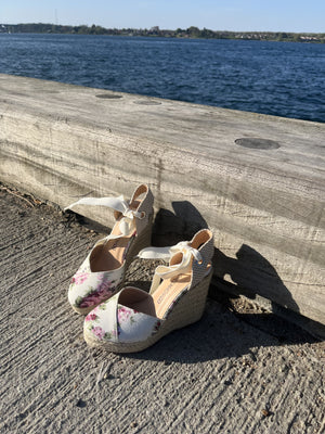 Den smukke overflade prydes af et delikat blomstermotiv, som tilføjer et strejf af romantik og friskhed til ethvert outfit. Med en elegant kilehæl på 9 cm får du ikke kun en flatterende højde, men også en stabil og komfortabel støtte, der gør skoene velegnede til både festlige begivenheder og lange dage, hvor stil og komfort skal gå hånd i hånd.