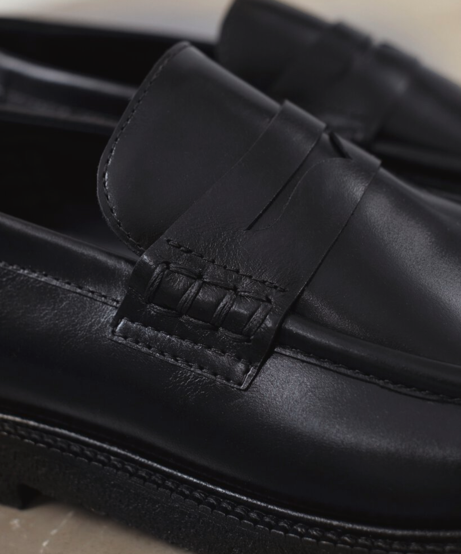 Med sin dekorative rand, stilrene sorte læder og klassiske penny loafer-detaljer passer skoen perfekt til både kontoret, hverdagen og mere formelle anledninger. Den brede læst og rummelige pasform gør modellen særligt velegnet til dig med lidt bredere fødder.