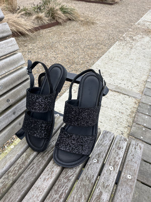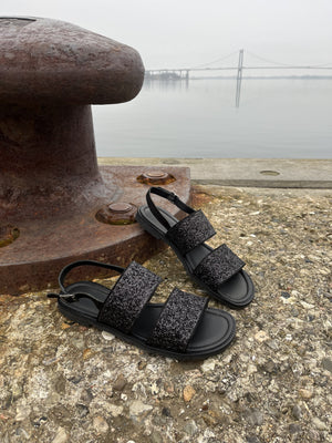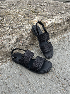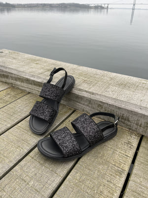 Sandalen er fremstillet af højkvalitetsmaterialer og har en elegant sort farve med et diskret glimmer, der tilføjer et sofistikeret touch. Det glimtende finish giver sandalen et eksklusivt look, der passer både til hverdag og fest.