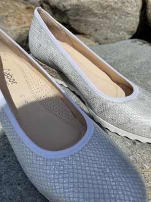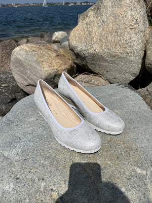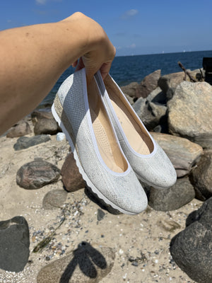 Lys stribet ruskind ballerina med kork kilehæl og gummisål. Smal elastik kant i udskæringen gør at skoen sidder pænt om foden. Skoen har Comfort vidde G. Kilehæl 2,5 cm. Fås i størrelse 43-44