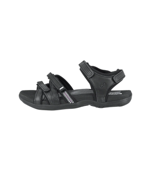 Den sorte sandal er fremstillet i glat skind kombineret med elastisk lycra, som giver både et moderne udtryk og maksimal bevægelighed. De smalle velcroremme sikrer, at sandalen nemt kan tilpasses – også hvis du har brug for ekstra plads over foden i str. 42 eller 43. Den fugtabsorberende Soft Tex indersål holder fødderne tørre, mens den lette phylon-ydersål med gummi giver stabilitet og sikkert fodfæste hele dagen.