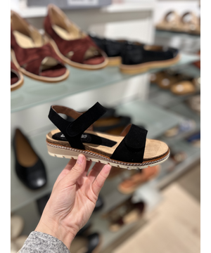 Sandalen er fremstillet i blødt ruskind og læder, hvilket giver et eksklusivt look og en behagelig følelse mod huden. Den er designet med bløde og stødabsorberende såler, som sikrer optimal støtte og komfort hele dagen. Med to justerbare velcrostropper kan du nemt tilpasse sandalen, så den passer perfekt til din fod – uanset bredde.