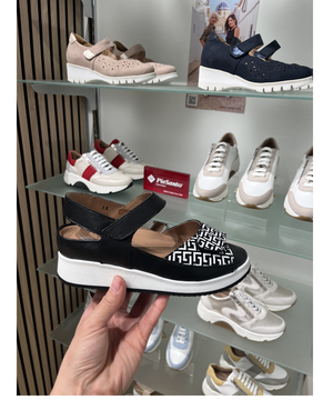 Leder du efter en elegant og komfortabel damesandal i små størrelser? Så er Pie Santo sandal i Sort (artikelnummer 250422-734) det perfekte valg for dig. Denne smukke sandal er designet med fokus på både stil og pasform – ideel til dig med smalle fødder eller behov for små damestørrelser som str. 33, 34 eller 35.
