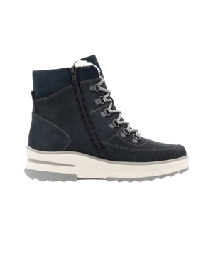 Støvlen er fremstillet i blødt ruskind i en stilren stålblå farve, der tilfører garderoben et moderne og sofistikeret udtryk. Indvendigt er den foret med ægte uld, som holder fødderne varme selv i frostgrader. Den vandtætte TEX-membran beskytter effektivt mod sne og slud, så du trygt kan bevæge dig ud i vintervejret.
