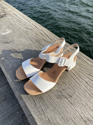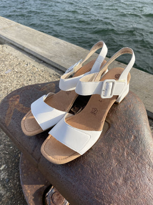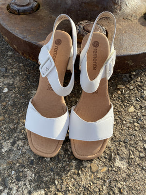 Flot hvid sandal fra Remonte til damer. Fås i str. 43-44-45. Sandalen er med velcrorem ved forfoden, og lukkes med velcrorem rundt om vristen. Elegant spænde, som giver sandalen er flot detalje. Men blokhæl på 5 cm, og bløde såler.