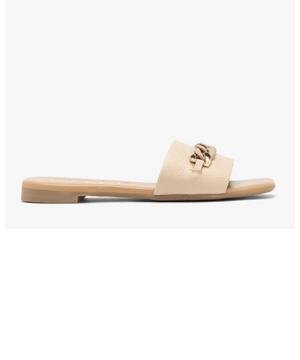 Sandalen er lavet af blødt beige læder og fremhæves af en markant guldkæde over vristen, som tilføjer et sofistikeret touch til ethvert outfit. Den neutrale farve gør den nem at matche med både jeans, kjoler og sommerens lyse farver.